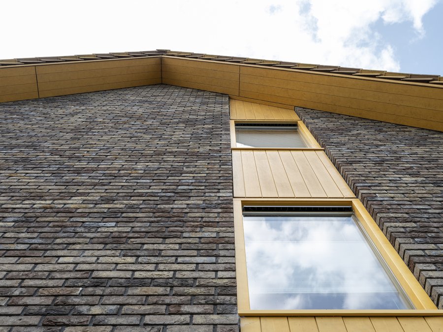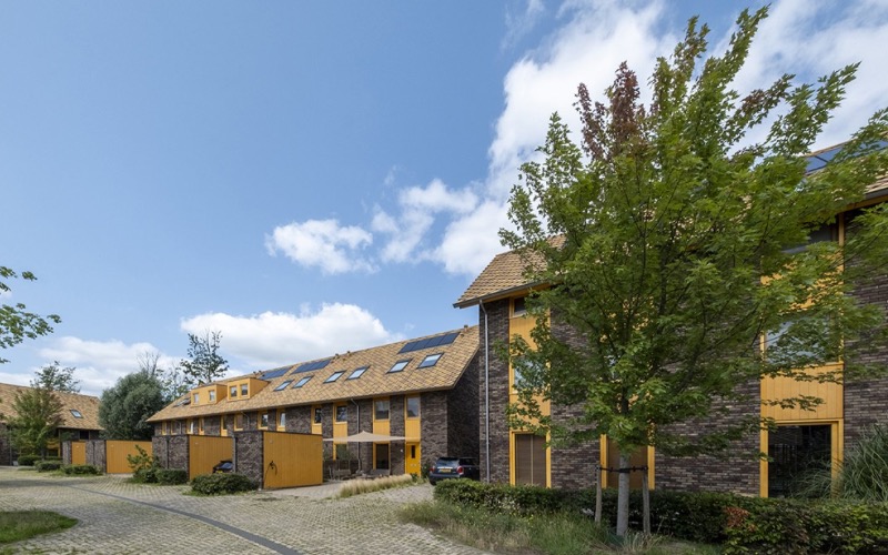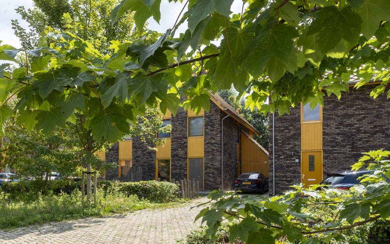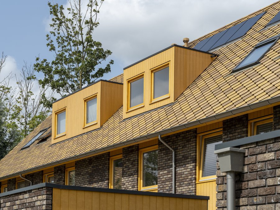 De materialisatie sluit naadloos aan bij dat natuurlijke concept. Voor de gevels en kozijnen is gekozen voor duurzaam Accoya-hout, dat niet alleen esthetisch mooi vergrijst, maar ook uitzonderlijk vormvast en onderhoudsarm is. De gevels – met hun bijzondere reliëf en bladerachtige patronen – geven de wijk een uitgesproken, organisch karakter dat perfect past bij de visie van Boomrijk.