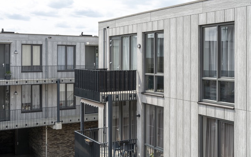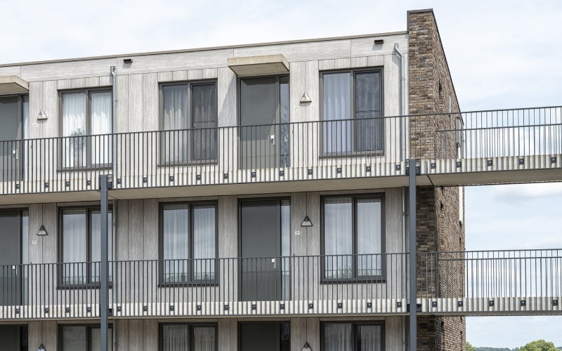Bouwbedrijf Pennings uit Rosmalen heeft ons gevraagd de gevelbekleding aan de galerijzijden volgens plan uit te voeren. Omdat brandveiligheid – gelukkig – een steeds grotere speelt in de bouw, is gekozen voor Rockpanel FS-Xtra. Het materiaal is onderhoudsarm en voldoet aan alle brandveiligheidseisen. Het betreft de kleur Woods Marble Oak en heeft de uitstraling van echt hout. Leuk extraatje is dat Rockpanel FS-Xtra dezelfde stoere uitstraling heeft als de stadsmuren waar het plan op geïnspireerd is.