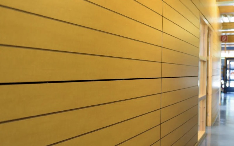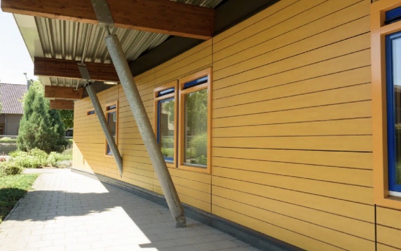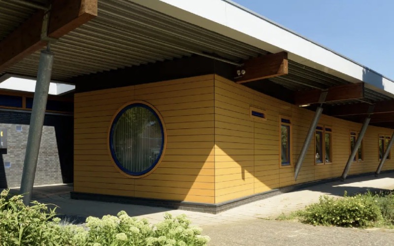 “Onze architect kwam met het idee voor Massief NT-platen van Plastica. Daar hadden ze vaker mee gewerkt bij scholen. Wij vroegen ons toen eerst nog wel af of het duurzaam was en of de kleur niet zou vervagen, maar de architect haalde ons over en we kozen buiten én binnen voor dezelfde warm gele platen. Dat past ook bij de visie van onze school: dat de binnenkant en de buitenkant met elkaar in verbinding zijn en dat je aan de buitenkant niet iets anders laat zien dan dat je vanbinnen bent. Die verbinding van binnen-buiten valt mensen direct op als ze hier voor het eerst zijn en verder zorgt het ook voor een heel rustig en goed gevoel.”