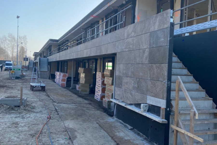 In totaal hebben we het dan over 2033 m2 bekleding. De totale opbouw van de gevel is een zogenoemde ‘end use testgevel’ die voldoet aan brandklasse B. Hoe mooi dat allemaal wordt zie je binnenkort hier.