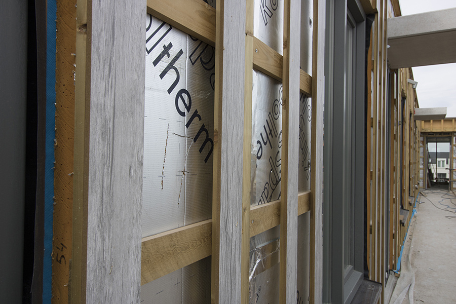-houten achterconstructie met een ROCKPANEL strookof op een