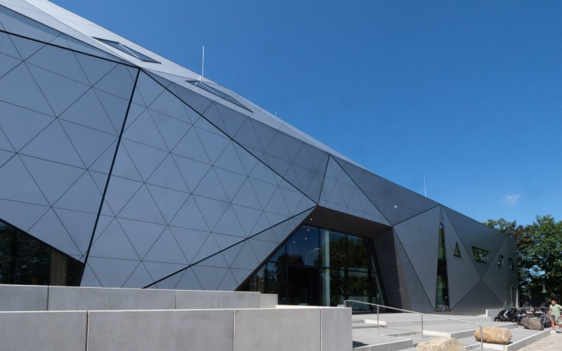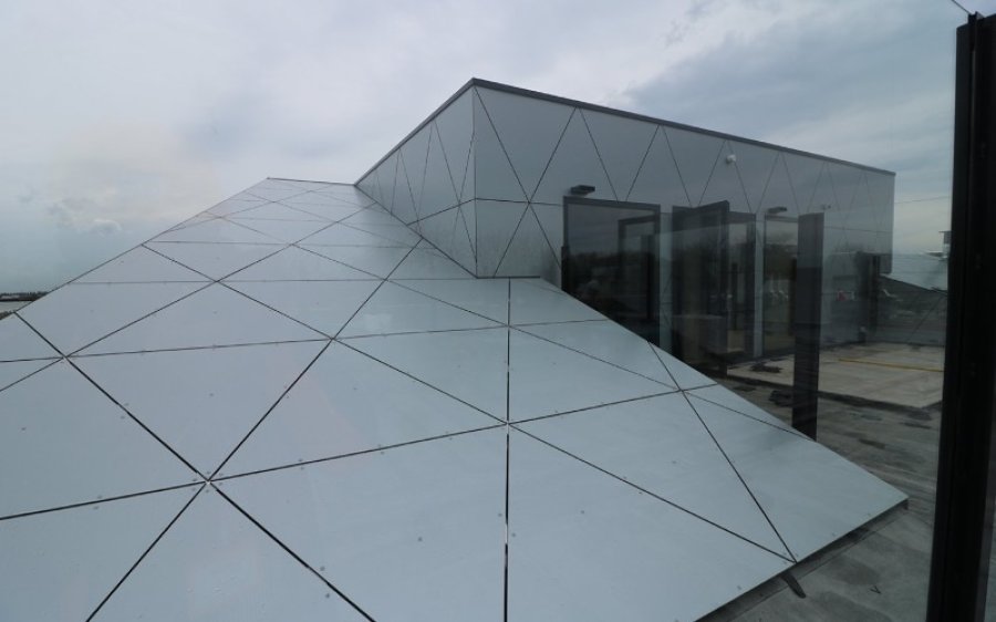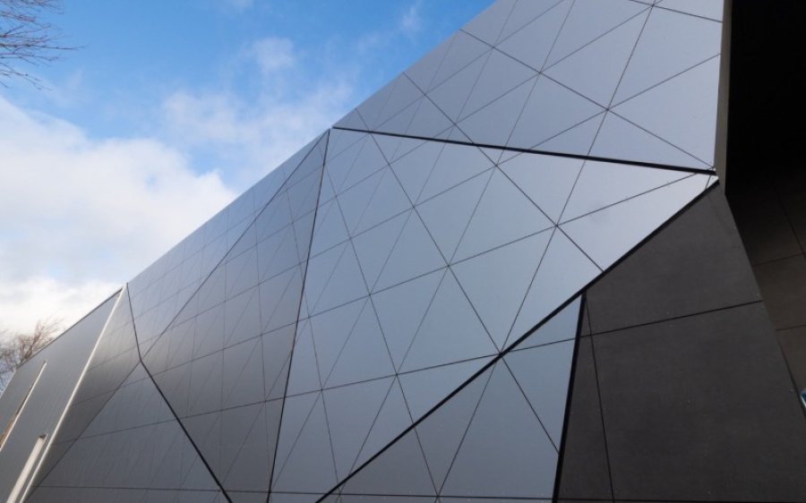 Wij zijn aan de slag gegaan met de gevelbekleding. Gekozen is voor Trespa Meteon in de uitvoeringen Aluminium Grey met een satijnen oppervlakteafwerking van in totaal maar liefst 1500 m2! Op maat gemaakt en geleverd door Jongeneel Eindhoven. De driehoekige panelen vormen een prikkelend visueel effect. Door de manier van plaatsing lijkt de gevel nergens vlak en ontstaat er een onvergetelijke uitstraling.