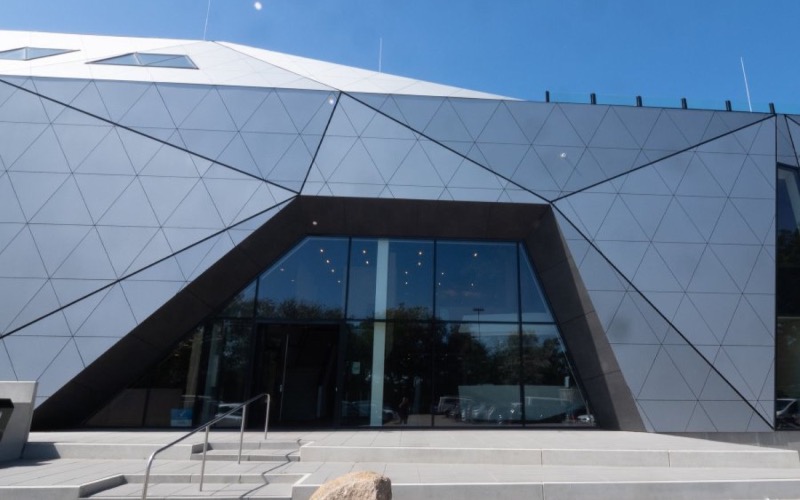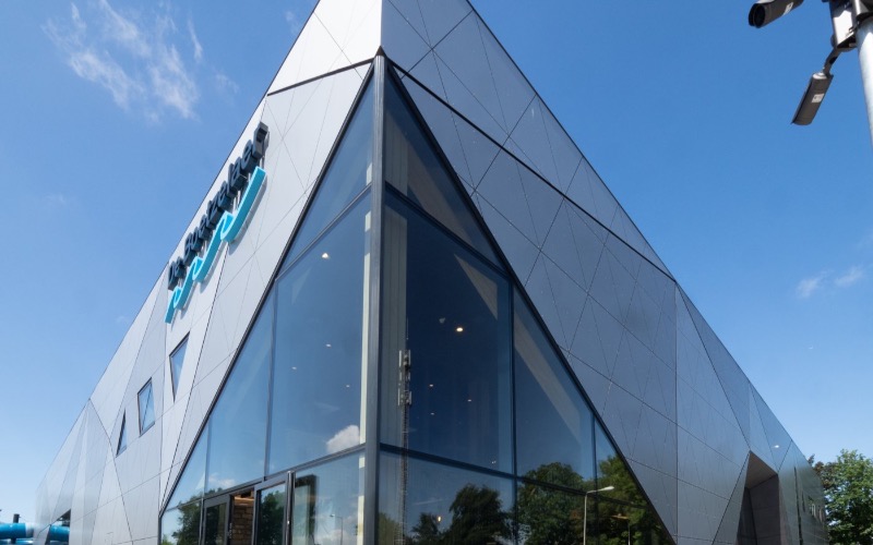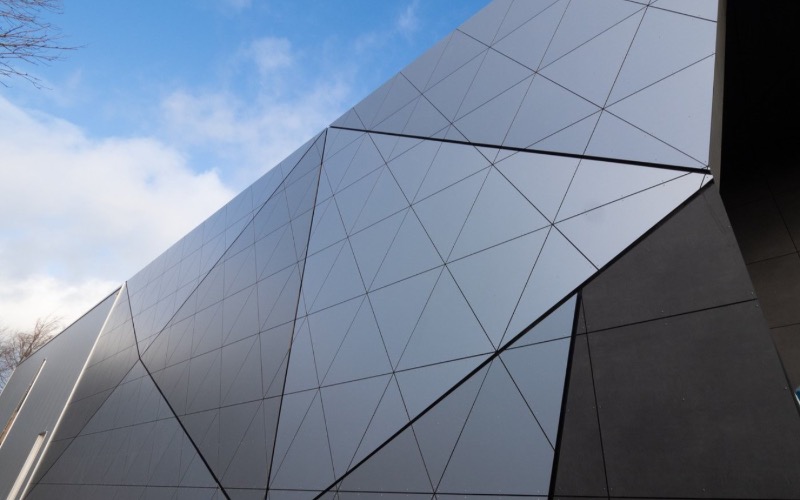 De gevel is bekleed met 1.500 m² Trespa Meteon-panelen in twee kleuren: Aluminium Grey met een satijnen afwerking en Natural Slate met een matte uitstraling. Door de bijzondere plaatsing van de driehoekige panelen ontstaat een dynamisch visueel effect, waardoor de gevel nergens vlak oogt. Jongeneel Eindhoven verzorgde de levering van alle materialen, inclusief isolatie, aluminium achterconstructie en houten regelwerk. De panelen zijn door de Platerij in Utrecht op maat gezaagd op basis van de technische input van Flow Gevelbekleding.